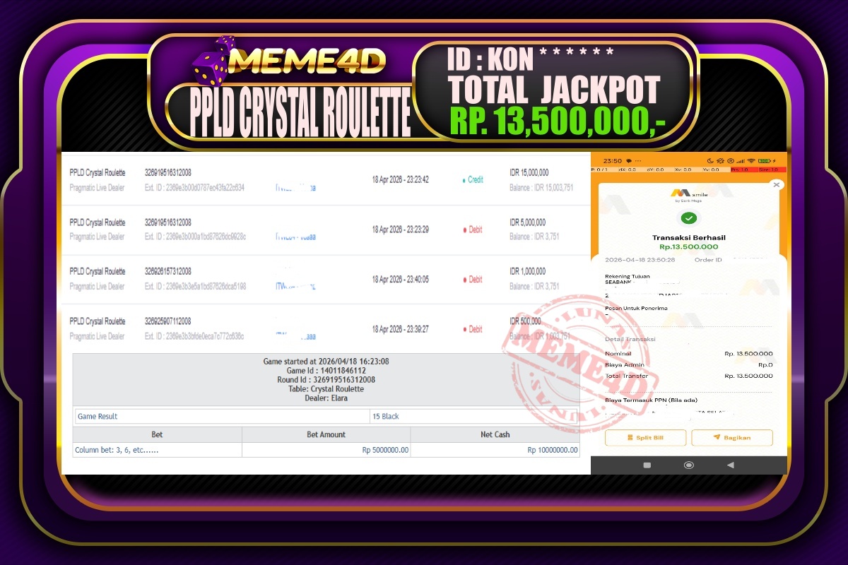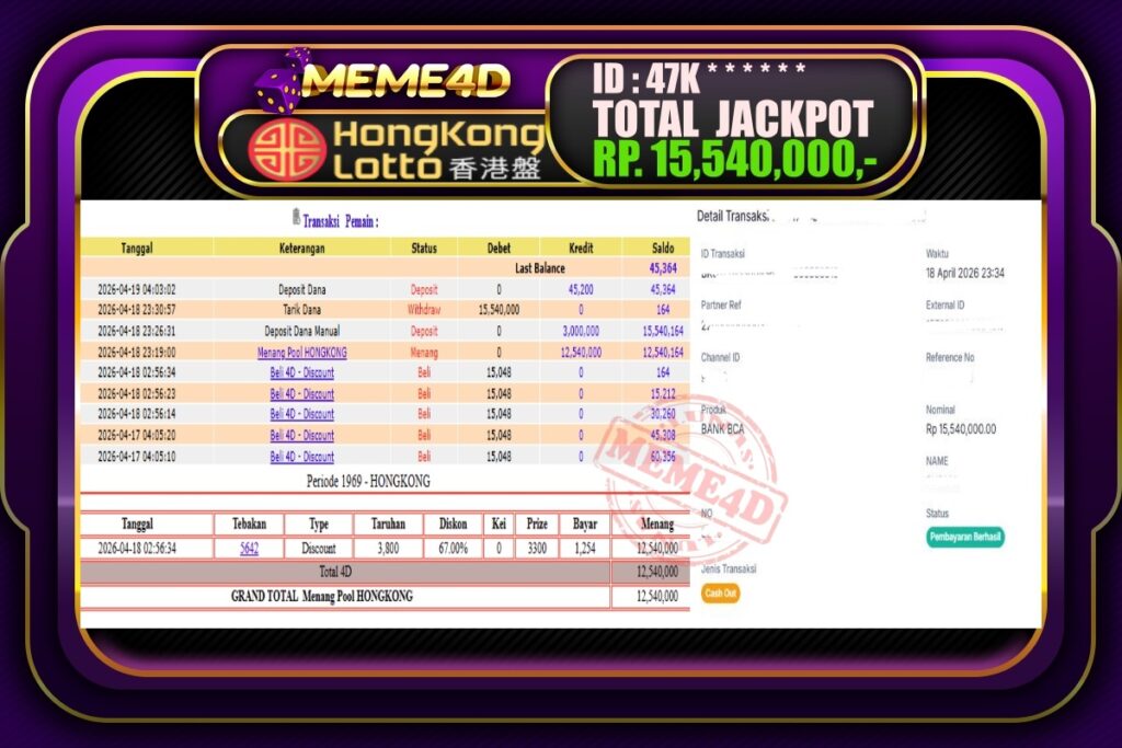 Bukti Jp MEME4D Casino Online 19 April 2026 – MEME4D merupakan situs terpercaya yang selalu membayar berapapun kemenangan semua pemain nya.