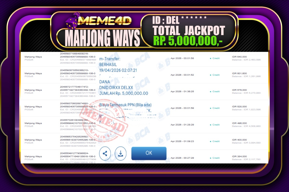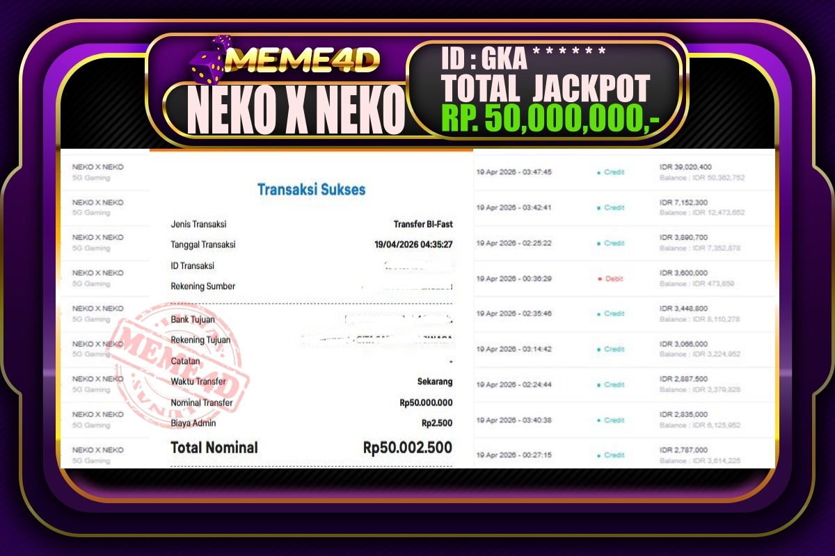 Bukti Jp MEME4D Slot Online 19 April 2026 – MEME4D merupakan situs terpercaya yang selalu membayar berapapun kemenangan semua pemain nya.