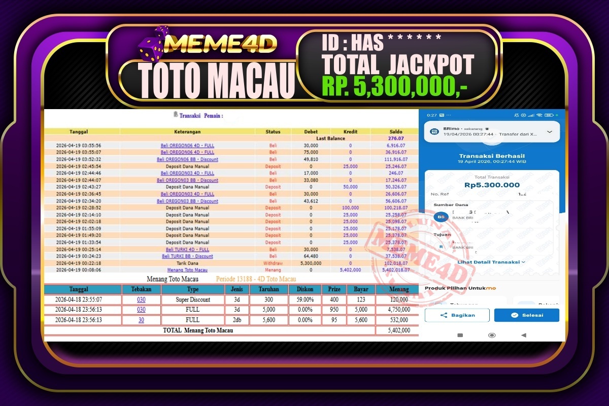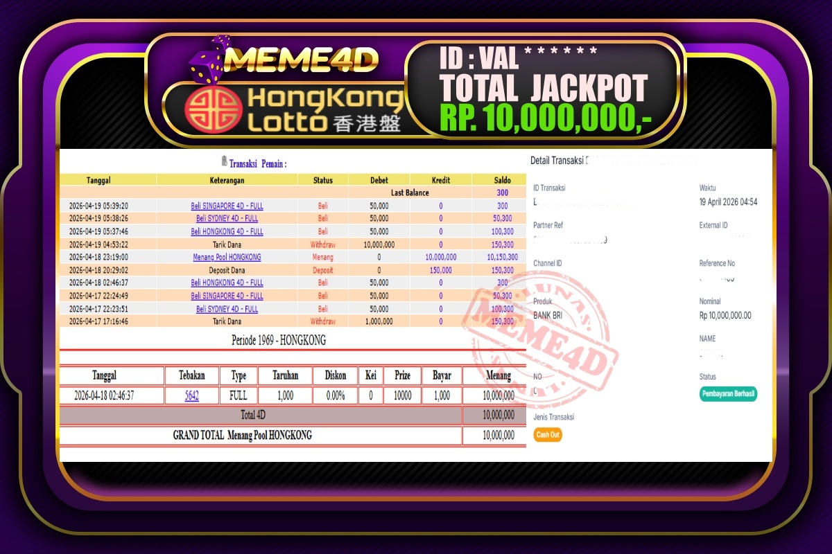 Bukti Jp MEME4D Casino Online 19 April 2026