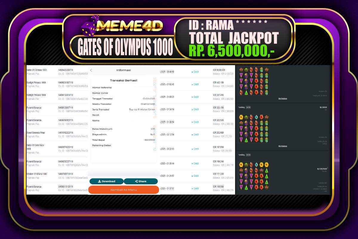 Bagi para pemain judi, tidak ada yang lebih memuaskan daripada melihat bukti nyata kemenangan dari pemain lain. Di Meme4D, banyak cerita inspiratif tentang jackpot yang telah dimenangkan, menunjukkan bahwa keberuntungan bisa datang kepada siapa saja. Setiap jackpot yang diraih bukan hanya hadiah uang, tetapi juga semangat dan motivasi bagi semua pemain untuk terus bermain dan mencoba peruntungan mereka.