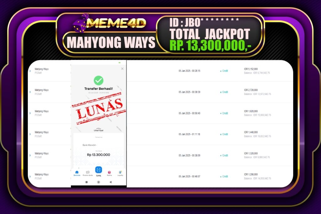 Bukti Jp MEME4D Slot Online 05 JANUARI 2025– MEME 4D merupakan situs terpercaya yang selalu membayar berapapun kemenangan semua pemain nya.