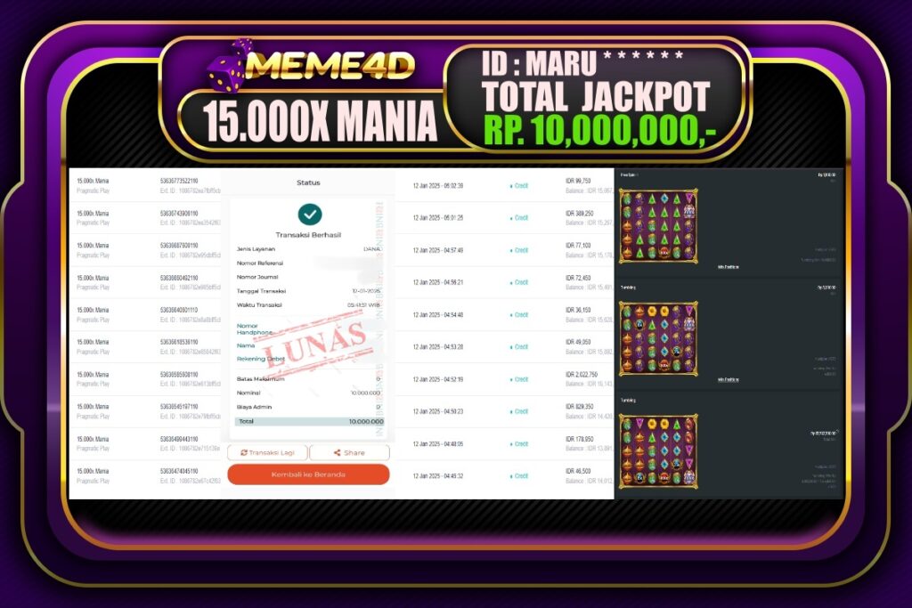 Bagi para pemain judi, tidak ada yang lebih memuaskan daripada melihat bukti nyata kemenangan dari pemain lain. Di Meme4D, banyak cerita inspiratif tentang jackpot yang telah dimenangkan, menunjukkan bahwa keberuntungan bisa datang kepada siapa saja. Setiap jackpot yang diraih bukan hanya hadiah uang, tetapi juga semangat dan motivasi bagi semua pemain untuk terus bermain dan mencoba peruntungan mereka.