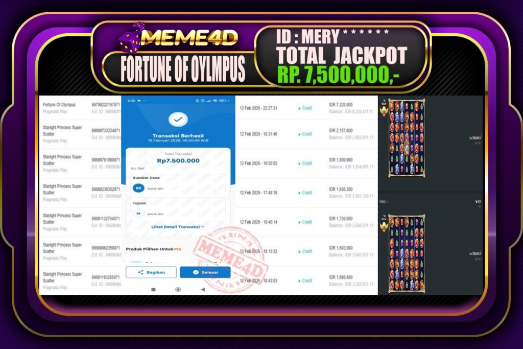 Bukti Jp MEME4D Slot Online 13 February 2026 – MEME4D merupakan situs terpercaya yang selalu membayar berapapun kemenangan semua pemain nya.