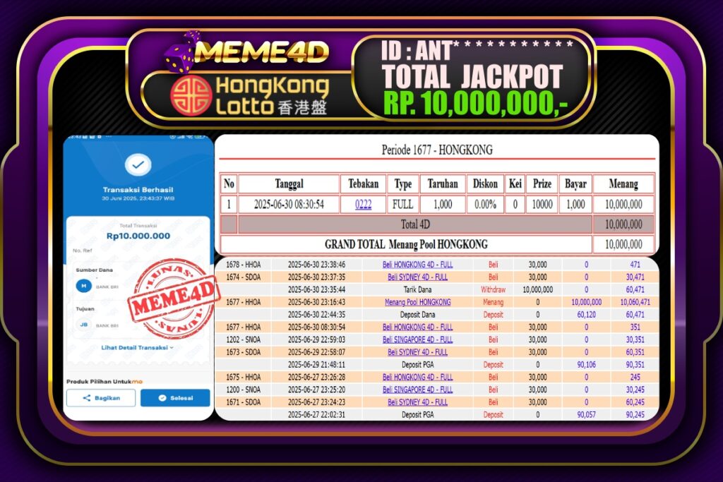 Bukti Jp MEME4D Togel Online 01 Juli 2025– MEME 4D merupakan situs terpercaya yang selalu membayar berapapun kemenangan semua pemain nya.