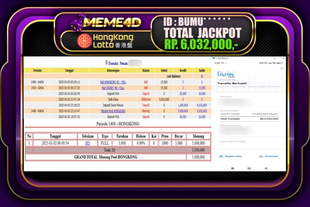 Bukti Jp MEME4D Togel Online 03 JANUARI 2025 – MEME 4D merupakan situs terpercaya yang selalu membayar berapapun kemenangan semua pemain nya.