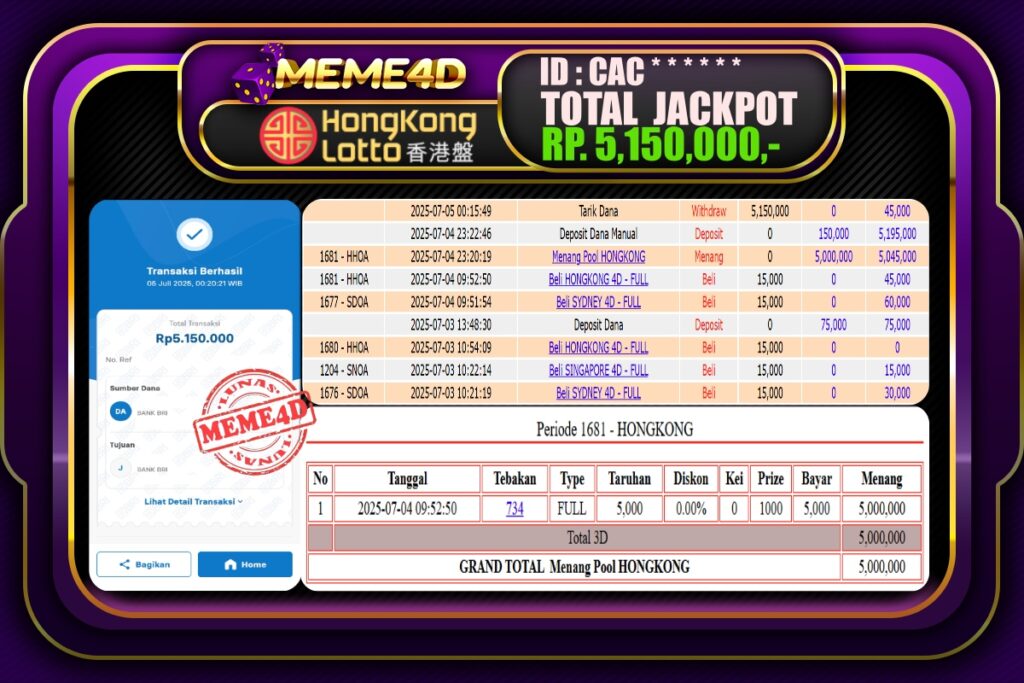 Bukti Jp MEME4D Togel Online 05 Juli 2025– MEME 4D merupakan situs terpercaya yang selalu membayar berapapun kemenangan semua pemain nya.