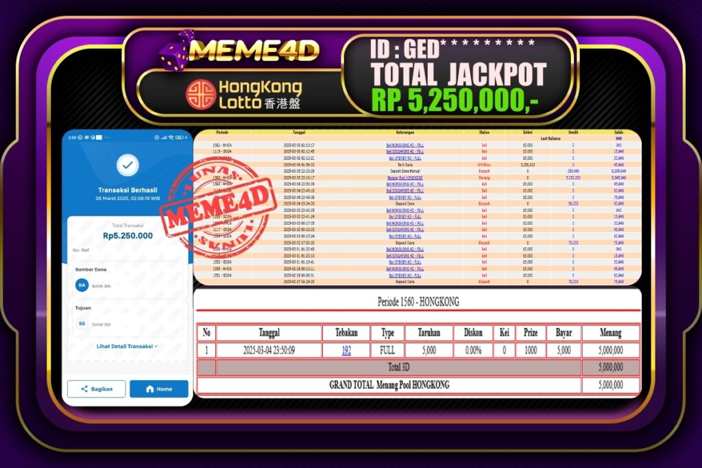 Bukti Jp MEME4D Togel Online 06 Maret 2025– MEME 4D merupakan situs terpercaya yang selalu membayar berapapun kemenangan semua pemain nya.