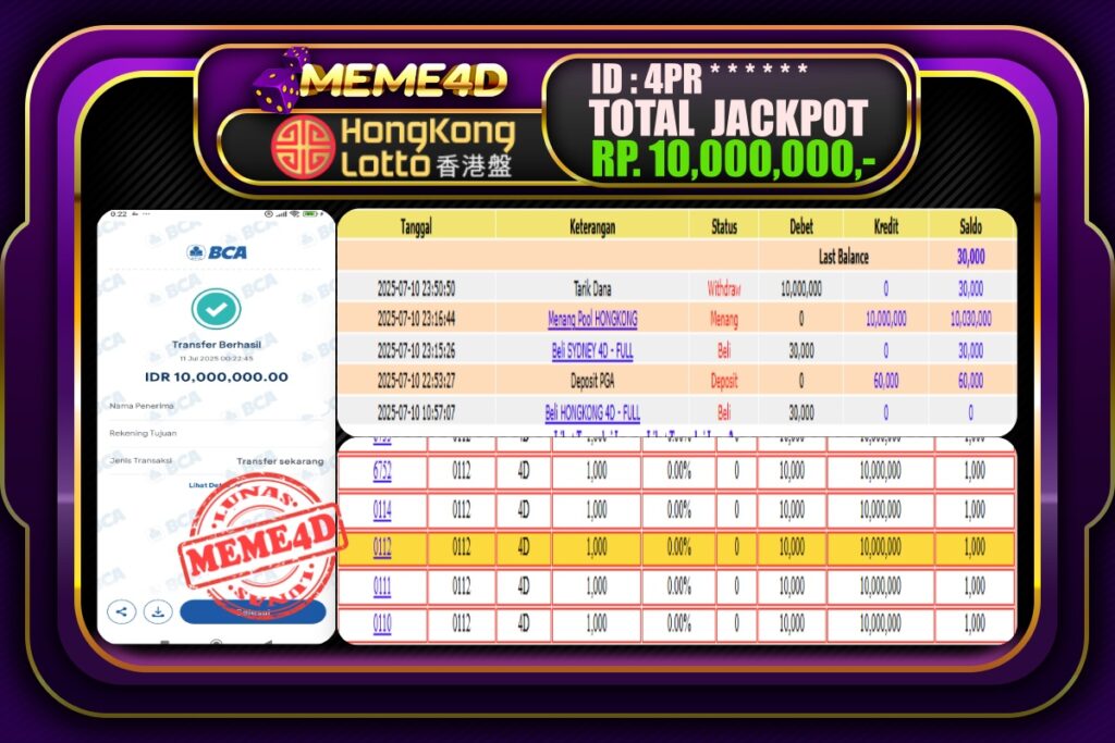 Bukti Jp MEME4D Togel Online 11 Juli 2025– MEME 4D merupakan situs terpercaya yang selalu membayar berapapun kemenangan semua pemain nya.