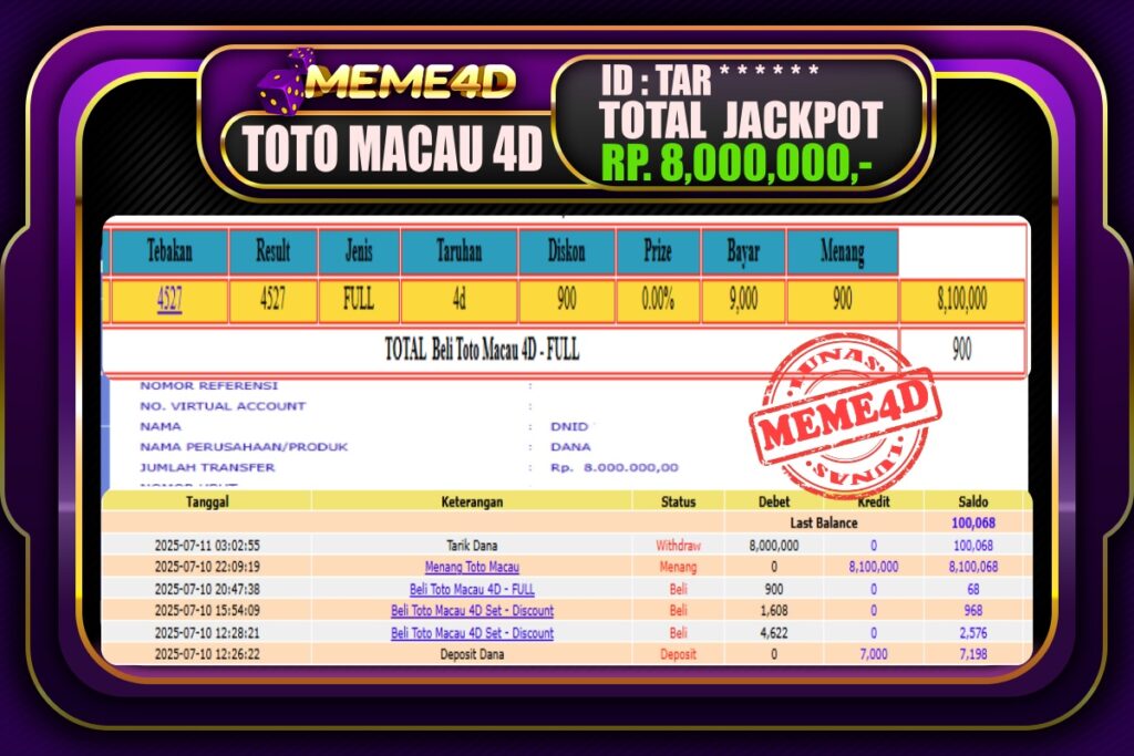 Bukti Jp MEME4D Togel Online 11 Juli 2025– MEME 4D merupakan situs terpercaya yang selalu membayar berapapun kemenangan semua pemain nya.