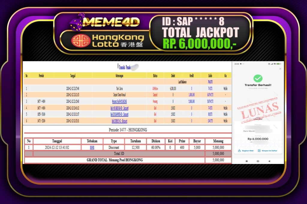 Bukti Jp MEME4D Togel Online 13 DESEMBER 2024 – MEME 4D merupakan situs terpercaya yang selalu membayar berapapun kemenangan semua pemain nya.