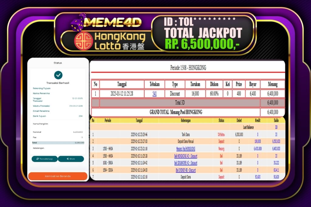Bukti Jp MEME4D Togel Online 13 JANUARI 2025 – MEME 4D merupakan situs terpercaya yang selalu membayar berapapun kemenangan semua pemain nya.