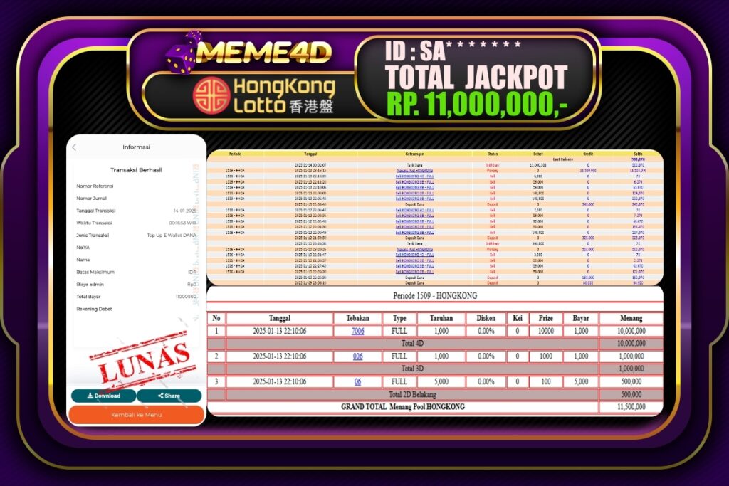 Bukti Jp MEME4D Togel Online 14 JANUARI 2025 – MEME 4D merupakan situs terpercaya yang selalu membayar berapapun kemenangan semua pemain nya.