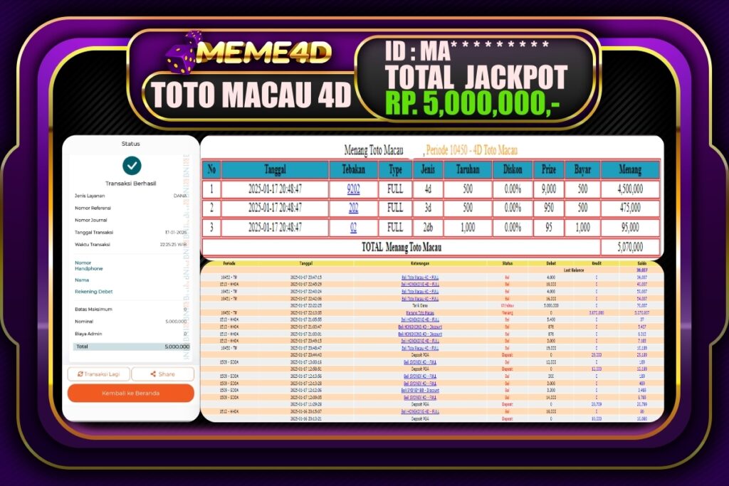 Bagi para pemain judi, tidak ada yang lebih memuaskan daripada melihat bukti nyata kemenangan dari pemain lain. Di Meme4D, banyak cerita inspiratif tentang jackpot yang telah dimenangkan, menunjukkan bahwa keberuntungan bisa datang kepada siapa saja. Setiap jackpot yang diraih bukan hanya hadiah uang, tetapi juga semangat dan motivasi bagi semua pemain untuk terus bermain dan mencoba peruntungan mereka.