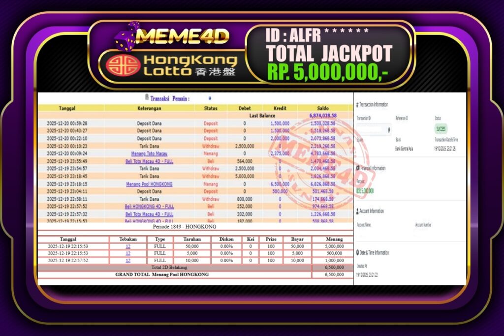 Bukti Jp MEME4D Togel Online 20 Desember 2025– MEME 4D merupakan situs terpercaya yang selalu membayar berapapun kemenangan semua pemain nya.