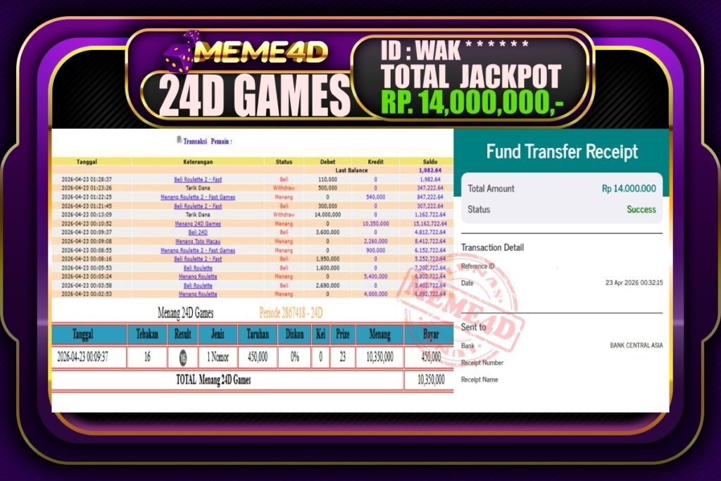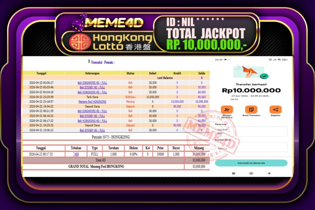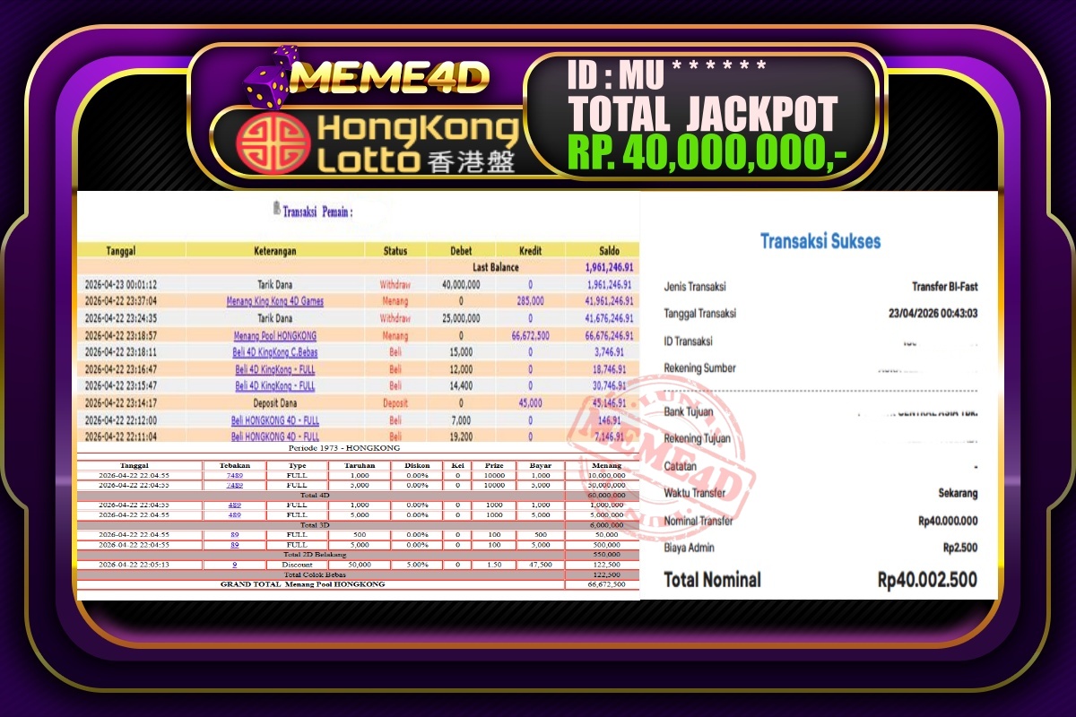 Bukti Jp MEME4D Togel Online 23 April 2026 – MEME4D merupakan situs terpercaya yang selalu membayar berapapun kemenangan semua pemain nya.