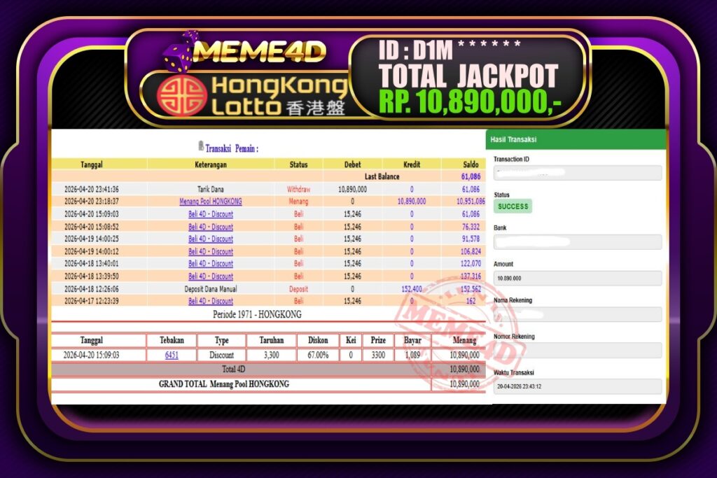 Bukti Jp MEME4D Togel Online 21 April 2026 – MEME4D merupakan situs terpercaya yang selalu membayar berapapun kemenangan semua pemain nya.