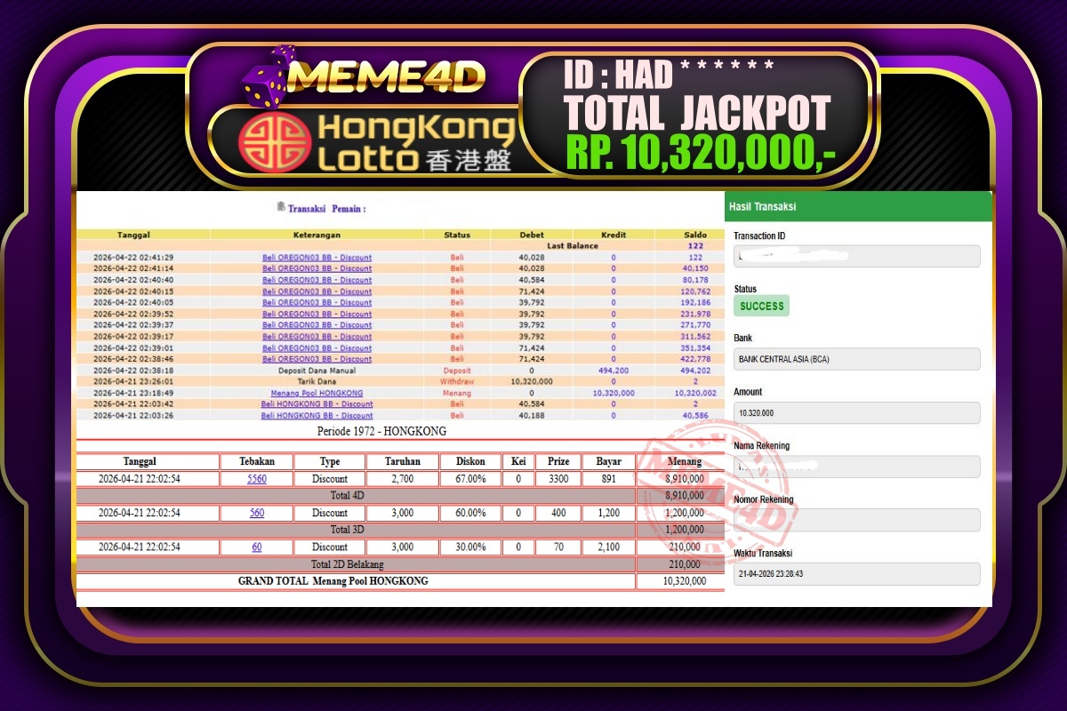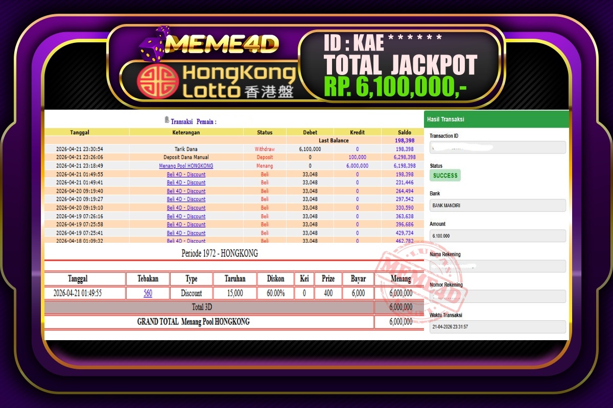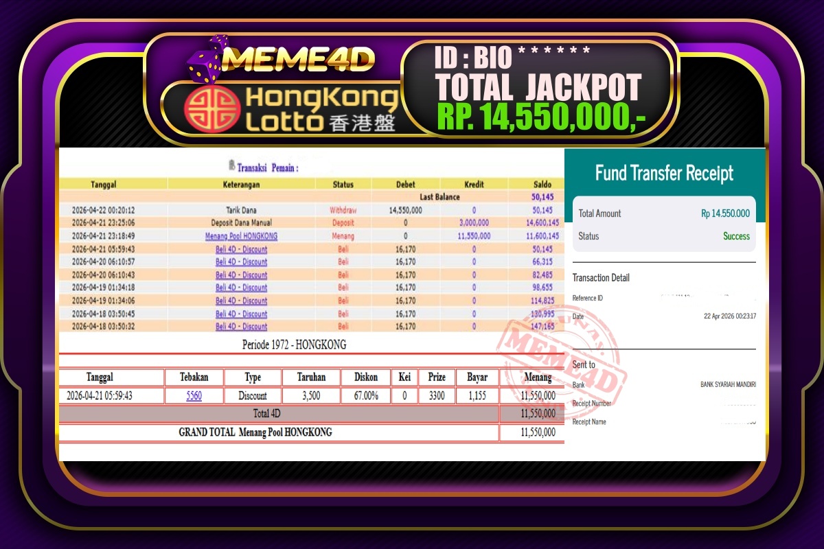 Bukti Jp MEME4D Togel Online 22 April 2026 – MEME4D merupakan situs terpercaya yang selalu membayar berapapun kemenangan semua pemain nya.