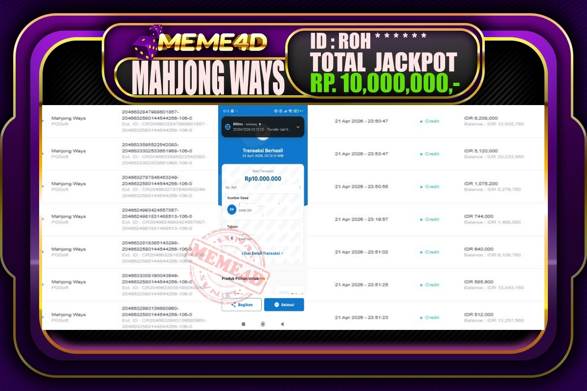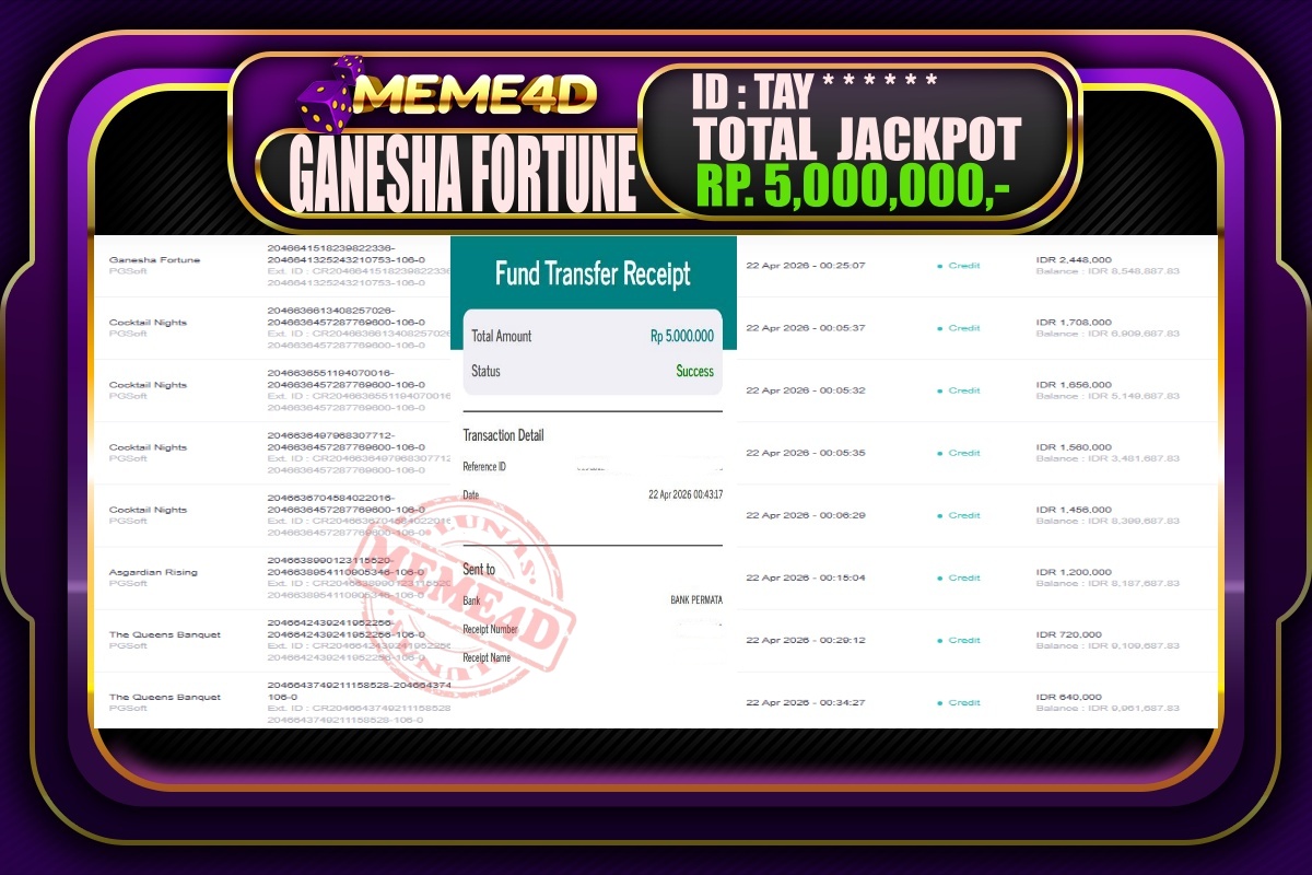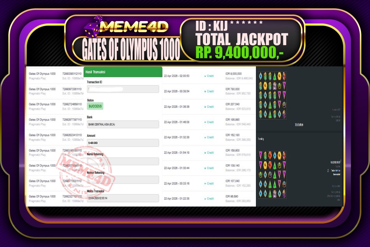 Bukti Jp MEME4D Slot Online 22 April 2026 – MEME4D merupakan situs terpercaya yang selalu membayar berapapun kemenangan semua pemain nya.